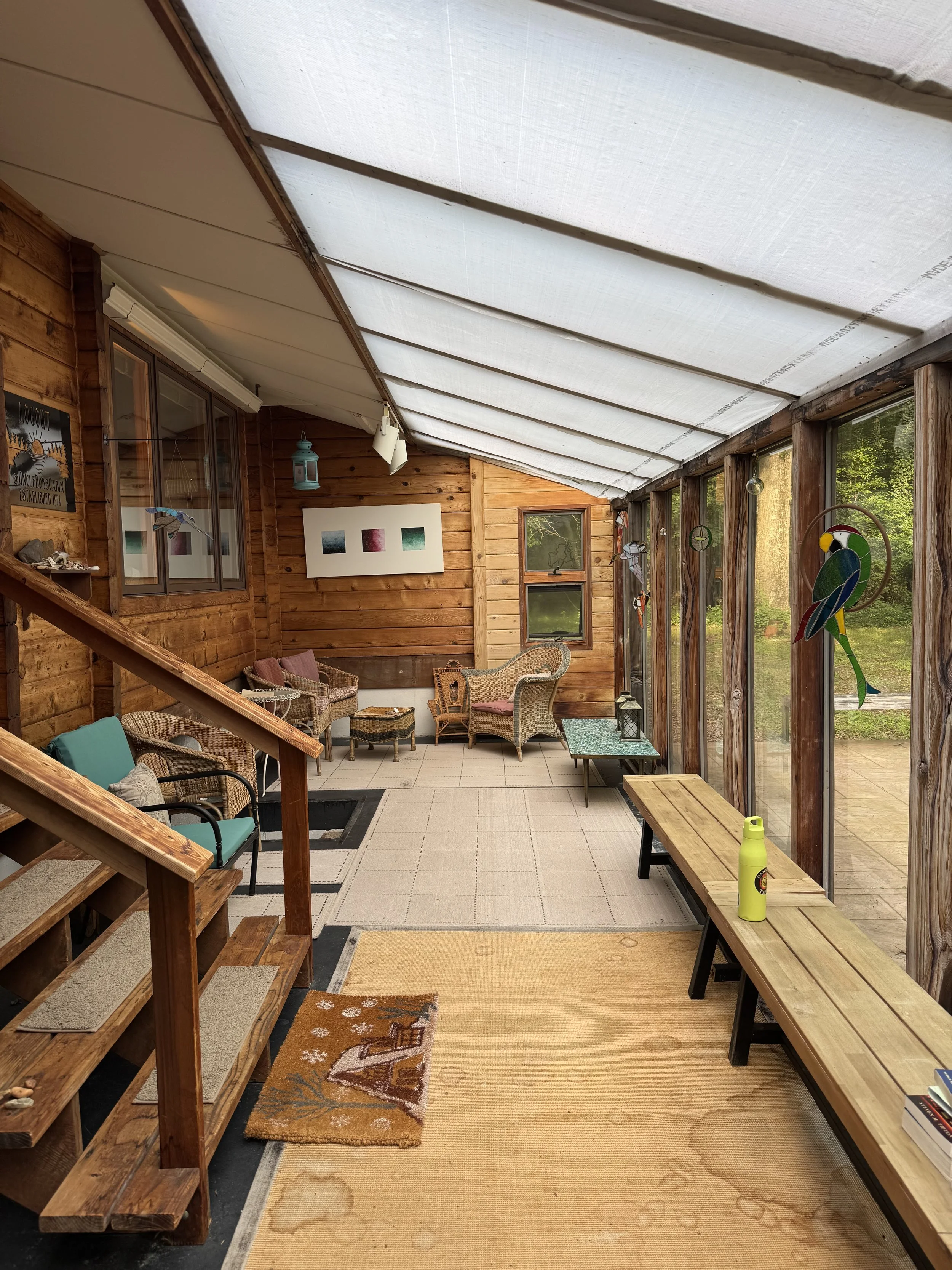 The cabin is a fully functional house with two bedrooms: one with a double bed and the other with a double and a twin. The main room has a working wood fireplace; the kitchen and separate dining room offer space to connect; and the greenhouse is the perfect spot to sit and enjoy the sun.